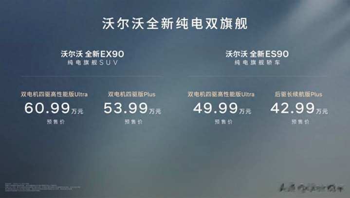 在沃尔沃汽车99周年庆典暨新品发布会上,沃尔沃全新纯电旗舰SUV EX90 及全新纯电旗舰轿车ES90正式开启预售,双旗舰预售价分别为53.99-60.99万(全新EX90)和42.99-49.99万(全新ES90)。对于追求极致安全、高品质出行的高净值群体而言,这两款双旗舰车型的到来,既延续了品牌刻在骨子里的安全信仰,更以全维度升级与极具诚意的定价,成为旗舰纯电市场的优选之作。